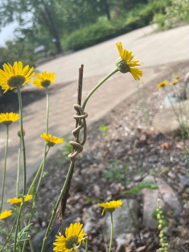 I often thought about the yellow chamomile bloom, and went back to visit her. Even among the identical flowers, she was easy to find. Her stem had healed and didn’t need the support system anymore, but I didn’t want to risk damage by trying to remove it.